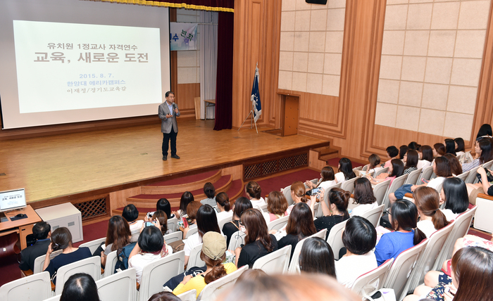 【경기인뉴스】이재정 경기도교육감은 지난 7일 오전 안산 한양대 학생회관 소극장에서 열린 ‘2015 유치원 1급 정교사 전반기 자격연수’에 참석하여 유치원 선생님들을 격려했다.