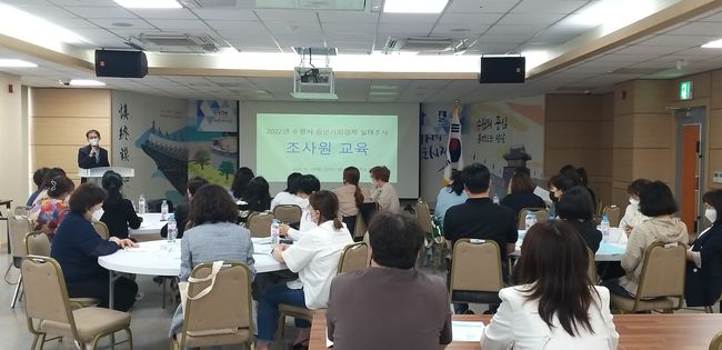 수원시가 6월 20일부터 7월 7일까지 만 19~34세 수원 청년 1000명을 대상으로 `2022년 수원시 청년사회경제실태조사`를 한다. 사진은 `2022년 수원시 청년사회경제실태조사` 조사원 교육 모습이다.