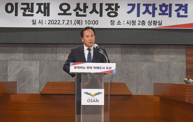 이권재 오산시장이 시 재정에 대하여 불필요한 사업을 중단하거나 재검토하는 등 강도 높은 재구조화를 하겠다는 내용의 `초긴축재정 예고` 기자회견을 하고 있다.