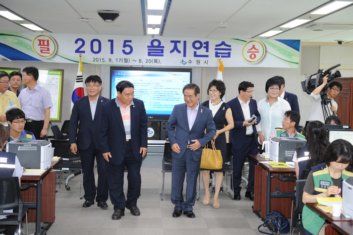 【경기인뉴스】수원시의회 의장단은 18일 시 통합방위상황실과 서수원우체국을 방문해 2015을지연습 훈련상황을 참관하고, 관계자들의 노고를 격려했다.