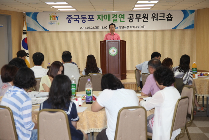 【경기인뉴스】수원시 팔달구(구청장 박흥식)는 지난 22일 토요일 구청 대회의실에서 팔달 거주 중국동포들의 안정적 정착 지원을 위해 '1 공무원, 1 중국동포 자매결연'에 참여한 공무원 61명을 대상으로 워크숍을 개최했다.