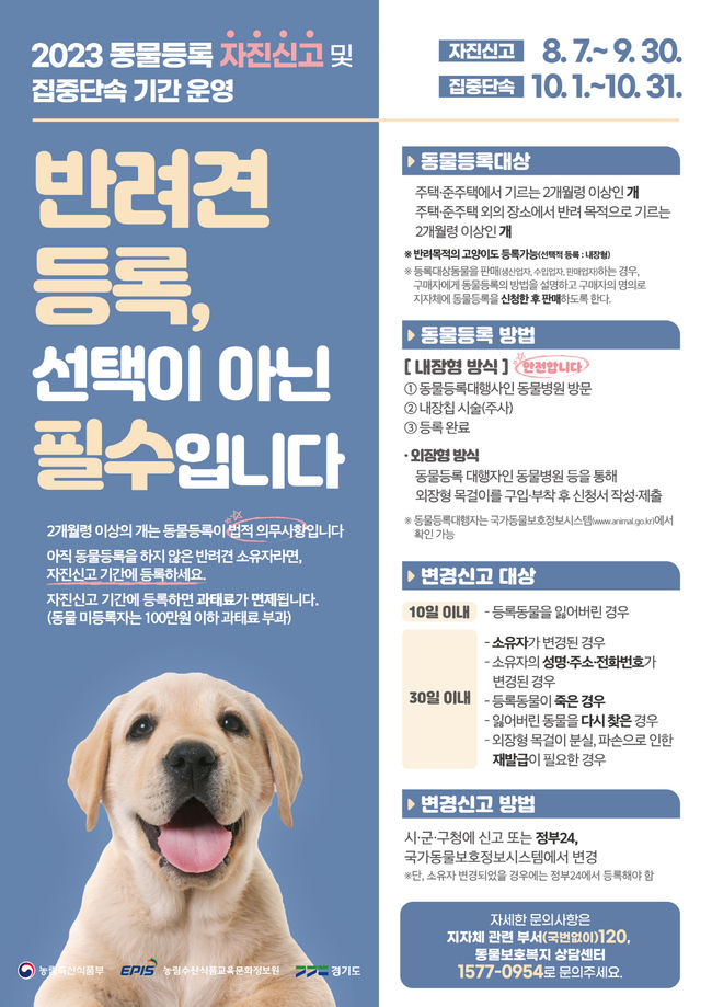시흥시가 8월 7일부터 9월 30일까지 2개월간 ‘2023년 동물등록 자진신고’ 기간을 운영한다고 밝혔다.