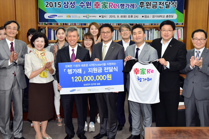 이날 기금 전달식에는 김기언 경기대학교 총장과 안재근 삼성전자 수원사회봉사단장, 배민한 수원시 복지여성국장 등 관계자가 참석했다.