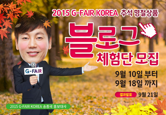 경기도와 경기중소기업종합지원센터(이하 경기중소기업센터)는 오는 11월 5일부터 4일간 고양 킨텍스에서 개최되는 ‘2015 G-FAIR KOREA(대한민국 우수상품전)’ 참가기업의 명절 관련 상품을 체험하는 ‘블로그 체험단’을 오는 18일까지 모집한다고 밝혔다.