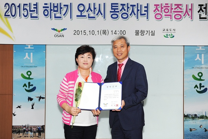 【경기인뉴스】오산시(시장 곽상욱)는 1일 오후 오산시청 물향기실에서 지역주민과 행정기관의 가교적 역할을 수행하는 통장의 자녀에 대한 ‘2015년도 하반기 통장자녀장학금 증서 전달식’을 가졌다고 밝혔다.