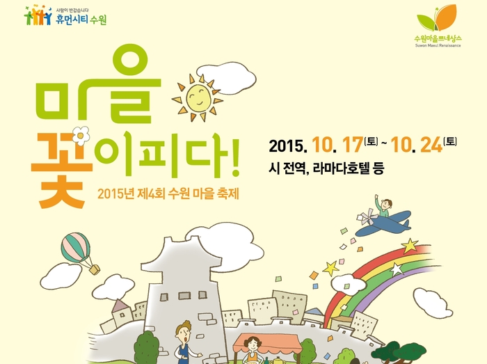 올해로 4회째를 맞는 2015 수원마을축제는 그동안 행정기관이 주도적으로 진행했던 기존의 마을축제에서 벗어나 마을 안에서 주민 스스로 계획하고 진행하는 주민주도형 마을축제로 개최된다.
