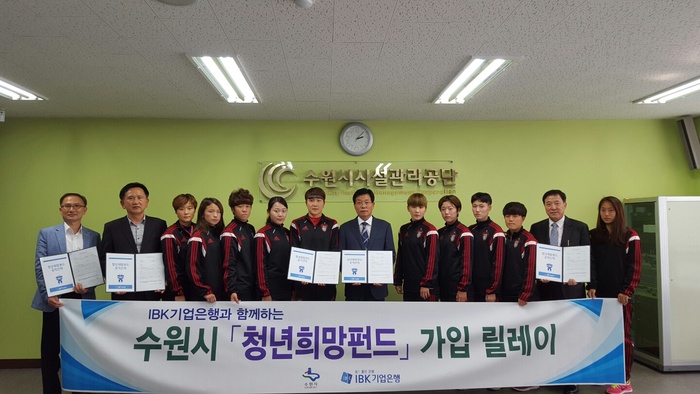 수원시시설관리공단(이사장 윤건모)은 21일 윤건모 이사장을 비롯한 수원시여자축구단과 각 부서장들이 참석한 가운데 공단 회의실에서 청년 일자리 창출을 위한 재원으로 쓰일 ‘청년희망펀드 공익신탁’에 가입했다.