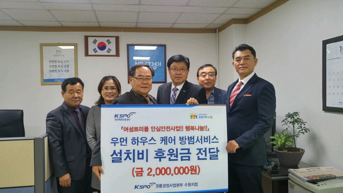 【경기인뉴스】국민체육진흥공단 경륜경정사업본부 수원시 지점(지점장 박용순)은 지난달 30일 수원시청 복지여성국장실에서 여성 트리플 안심안전 사업 행복나눔 행사로 우먼 하우스 케어 방범서비스 설치비 후원금 전달식을 가졌다.