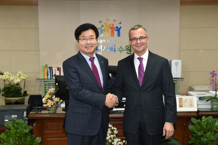 【경기인뉴스】염태영 수원시장은 26일 오후 2시 수원시청을 방문한 알브레히트 게르버 독일 브란덴부르크주 에너지경제부 장관과 환담을 갖고 온실가스 감축 문제 해결에 적극 나서기로 했다.