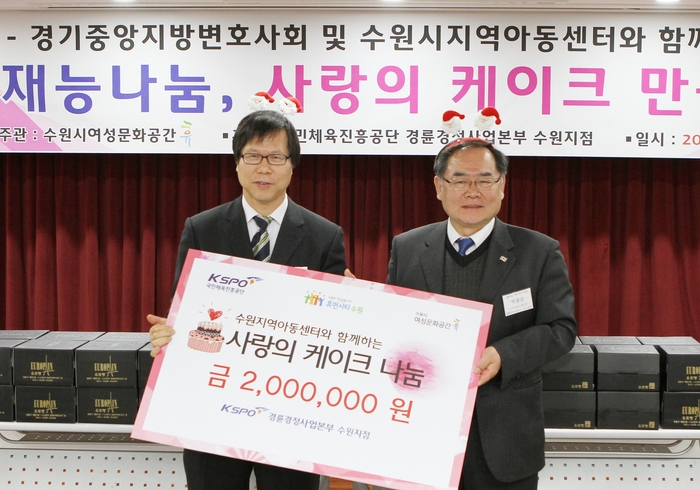 이날 참가자들의 따뜻한 마음으로 만든 사랑의 케이크 100여개는 수원시 지역아동센터에 전달되었다. 작년에 이어 올해도 국민체육진흥공단 경륜경정사업본부 수원지점(지점장 박용순)이 케이크 만들기 재료 일체를 지원했다.