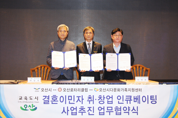 【경기인뉴스】오산시(시장 곽상욱)는 지난12일 국제로타리3750지구 오산로타리클럽(회장 김종구)과 오산시 다문화가족지원센터(센터장 이병희)와 다문화가족 지원을 위한 결혼이민자 취․창업 인큐베이팅 사업추진 등의 내용을 담은 업무협약을 체결했다.