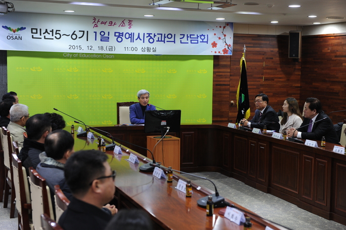 【경기인뉴스】오산시(시장 곽상욱)는 지난 18일 시청 상황실에서 민선 5~6기 역대 명예시장을 대상으로 간담회를 개최했다고 21일 밝혔다.