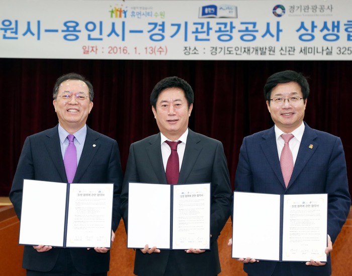 용인시는 지난 13일 경기도 인재개발원에서 정찬민 시장과 염태영 수원시장, 홍승표 경기관광공사 사장이 참석한 가운데 지역 관광협력 기반을 강화하는 상생협력 협약을 체결했다고 밝혔다.