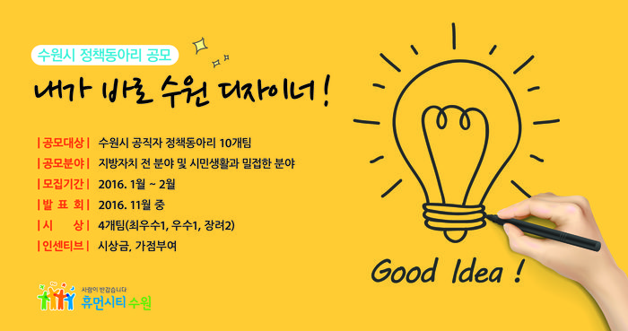 시 관계자는 “수원시 정책동아리는 공직 내 자율적인 학습문화 분위기를 확산하고 현장에서의 생생한 아이디어를 정책으로 발전시키기 위한 것”이라면서 “이번 정책동아리 공모를 계기로 창의적 정책 아이디어를 효과적으로 추출하고 활성화할 수 있는 시스템을 적극 개발해 나갈 계획”이라고 밝혔다.