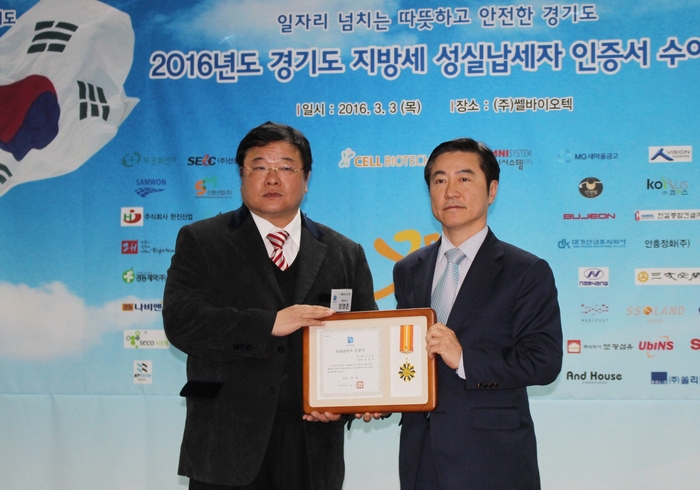 도는 3일 오후 2시 성실 납세 기업으로 선정된 김포 소재 ㈜쎌바이오텍에서 인증서 수여식을 개최했다. 이날 행사에는 349명 중 50명이 초청됐으며, 이재율 도 행정1부지사가 인증서를 수여했다.