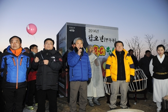 【경기인뉴스】채의선 기자 = 오산시(시장 곽상욱)는 새해 첫날 독산성과 세마대지 정상에서 2014년 갑오년(甲午年) 새해 해맞이 행사를 가졌다. 이날 행사에는 곽상욱 오산시장을 비롯한 최웅수 시의장, 시의원, 오산문화원 관계자와 많은 시민 등이 참석한 가운데 갑오년 새해 첫 일출을 바라보며 21만 시민의 건강과 행복을 기원하고 활기찬 변화 행복도시 오산 건설을 다짐했다.