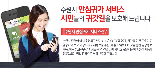 【시사인경제】수원시는 밤길 귀가가 불안한 여성과 학생들의 안전한 귀갓길 확보를 위해 개인 스마트폰과 수원시 전역에 설치 운영되고 있는 방범용 CCTV를 연계한 ‘안심귀가 서비스’를 개발 완료하고 15일부터 서비스를 시작한다.