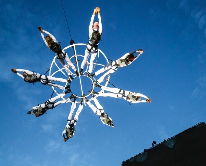 거꾸로 매달려 자리를 이동하고 한 사람씩 구조물에서 뛰어내려 하늘을 날 듯 공중그네를 타기도 한다. 때론 관객 머리 위까지 내려와 손을 잡으며 우주인이 내려온 듯 관객들과 교감한다.