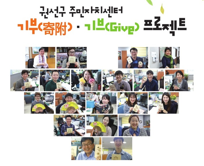 이는 4~5월에 걸쳐 주민자치센터에서 기부된 약 300여점의 작품 홍보를 위해 미소 사진을 찍은 후 다음 모델이 될 직원을 지명하여 계속 이어가는 릴레이 형식의 홍보 방식으로 박흥수 구청장을 시작으로 안전건설과 홍남석 주무관, 종합민원과 정지은 주무관 등 약 20여명의 직원들의 아름다운 미소가 기부 작품 판매 안내지 제작을 위해 기부되었다.