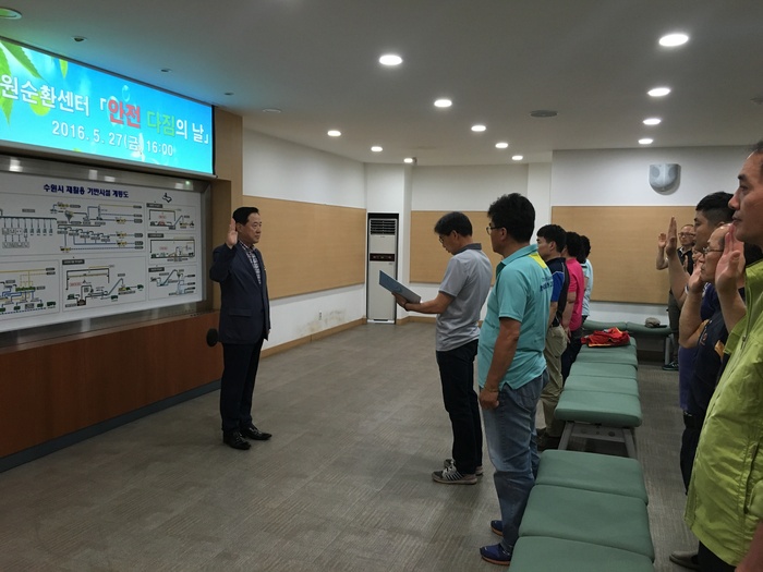 【시사인경제】수원시시설관리공단(이사장 김찬영) 자원순환센터는 지난 27일 오후 센터 홍보관에서 김찬영 공단 이사장을 비롯한 신범식 센터장과 직원 등 90여 명이 참석한 가운데 ‘제1회 안전 다짐의 날’ 행사를 열고 안전 결의문을 낭독하는 등 실천 의지를 다졌다.
