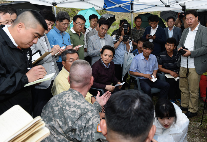 【시사인경제】남경필 지사는 15일 오후 3시 서장원 포천시장, 서형석 국방교육정책관, 제프리 브라이언(Jeffrey Brian) 미8군 사령부 민사부장, 테드 마틴(Ted Martin) 미2사단장 등과 함께 포천시 창수면에 위치한 자주포사격장 인근 창수면대책위사무실을 방문했다.