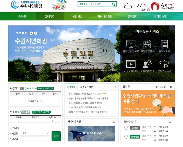 【시사인경제】수원시시설관리공단(이사장:김찬영)이 운영하는 대표 홈페이지(www.suwonfmc.or.kr)내에 사이버추모관(수원시연화장 www.suwonfmc.or.kr/suwonyhj)이 22일 공식 운영에 들어갔다. 이 사업은 고인이 계신 현장까지 직접 방문이 어려운 유족들의 편익을 위해 추진됐다.