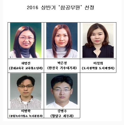 이번에 선정된 5명의 참공무원은 예산절감과 자원봉사 등 수원시 공무원의 위상을 높이고, 건전한 공직문화 조성에 기여한 점이 높게 평가됐다.