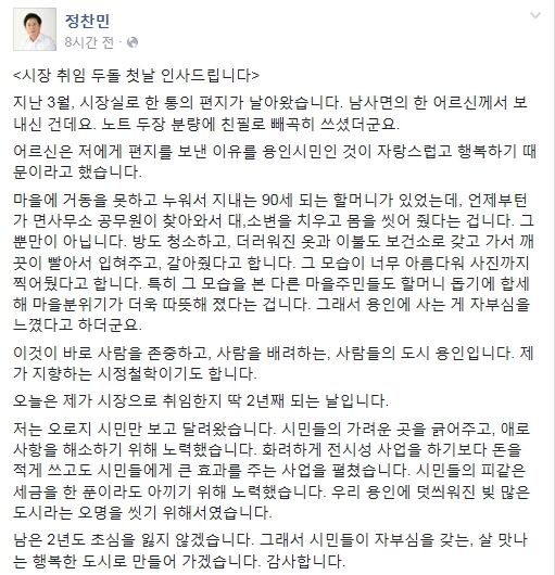 “시민들이 자부심을 갖는 도시를 만들겠습니다”라는 제목으로 글을 올린 정 시장은 ‘용인에 사는 게 자부심을 느낀다’는 어르신의 편지내용을 소개했다.
